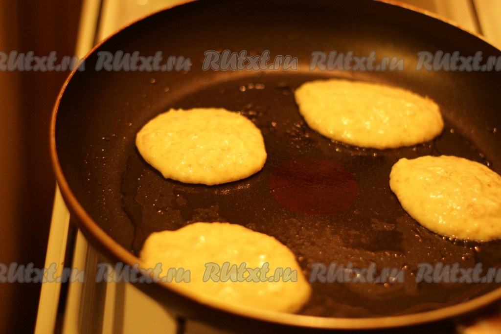 Сковородку смазать небольшим количеством растительного масла и жарить овсяные оладушки с двух сторон до появления золотистой корочки.