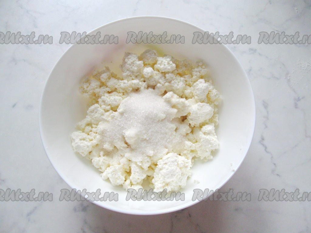 Всыпать сахар к творогу.