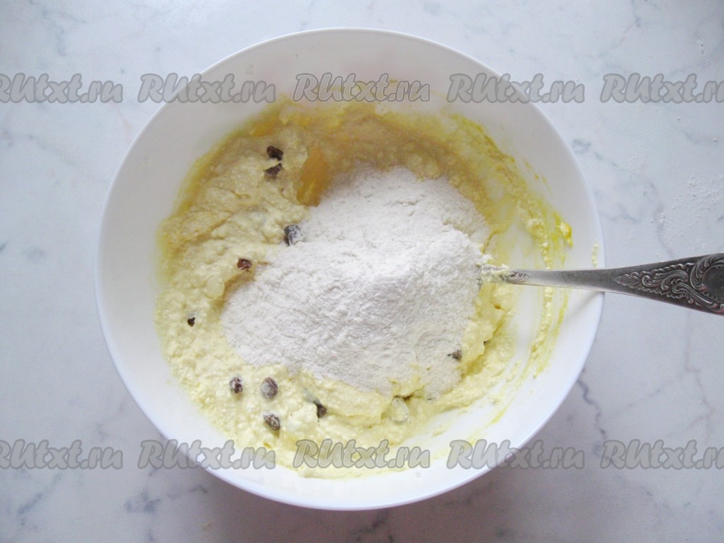 Всыпать в творожную массу 2 столовых ложки муки.