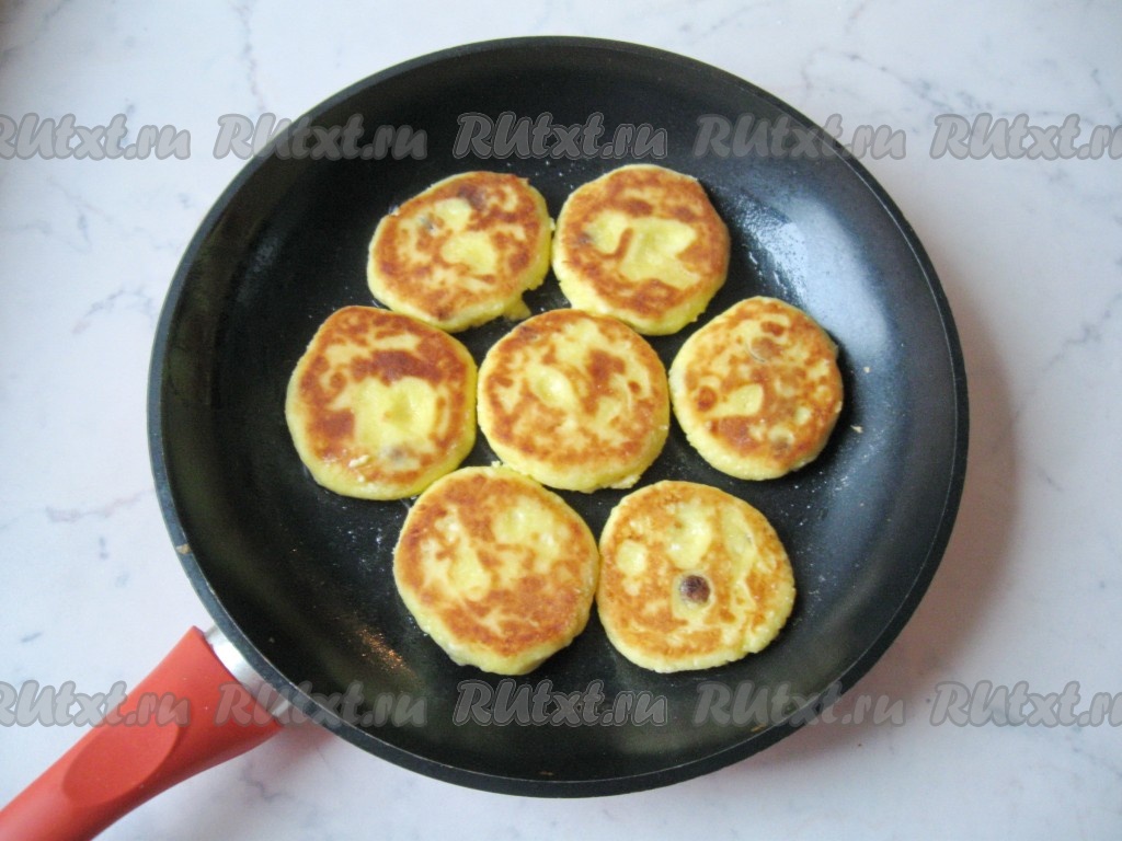 Затем сырники перевернуть и жарить их до подрумянивания со второй стороны (в течение 2-3 минут).