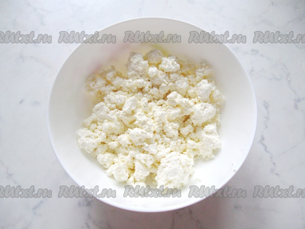 Творог лучше брать жирностью 5% и выше. Выложить творог в миску.