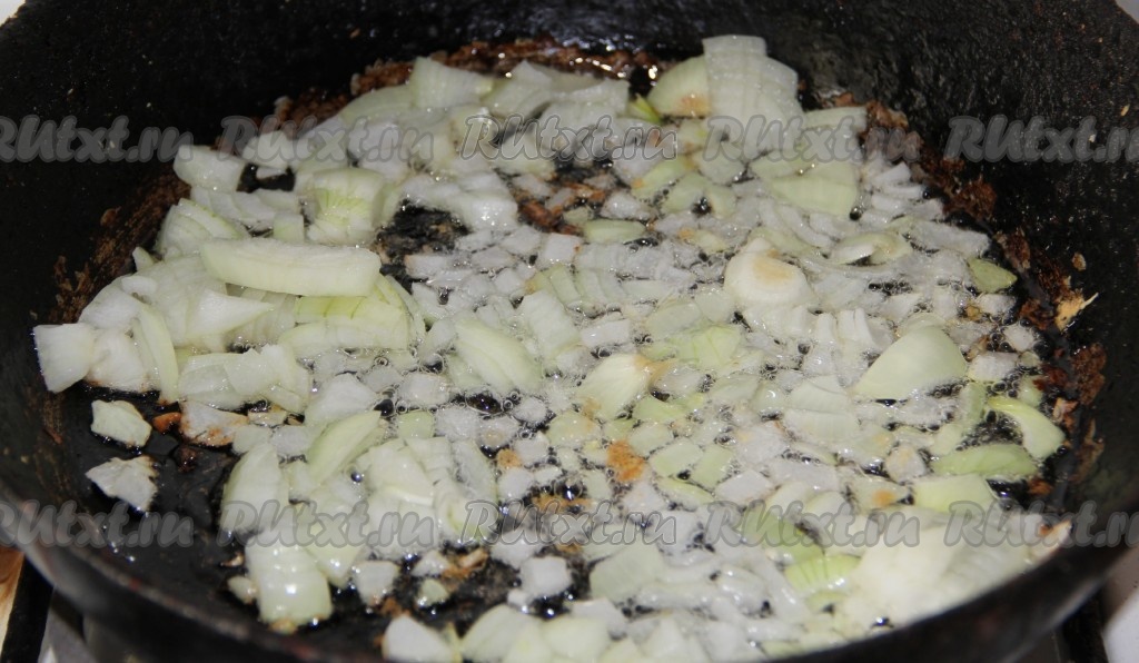 Лук режем и обжариваем на растительном масле, иногда помешивая.