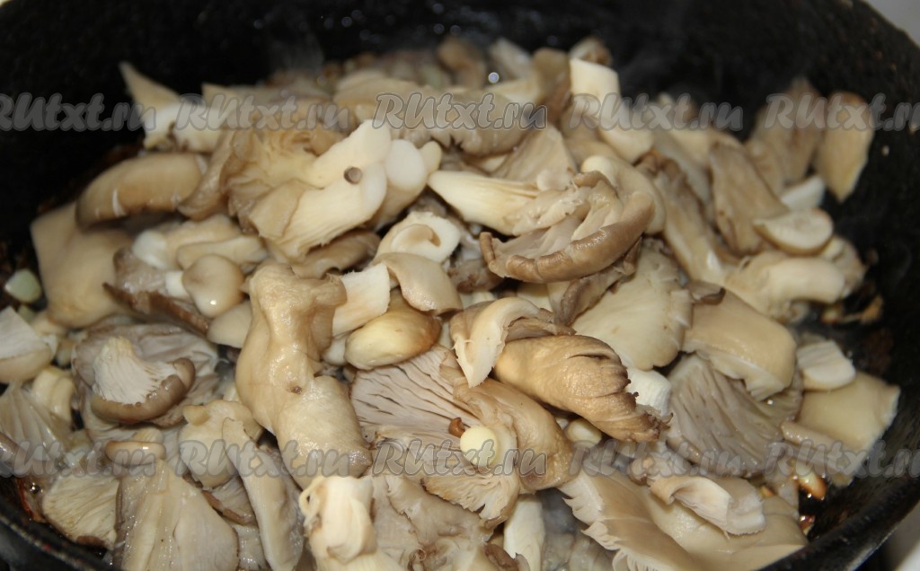 Когда лук подрумянится, добавляем крупно нарезанные вешенки (если нарезать мелко, грибы потеряются в картошке) и обжариваем, периодически помешивая, до испарения жидкости (в течение 10-15 минут).