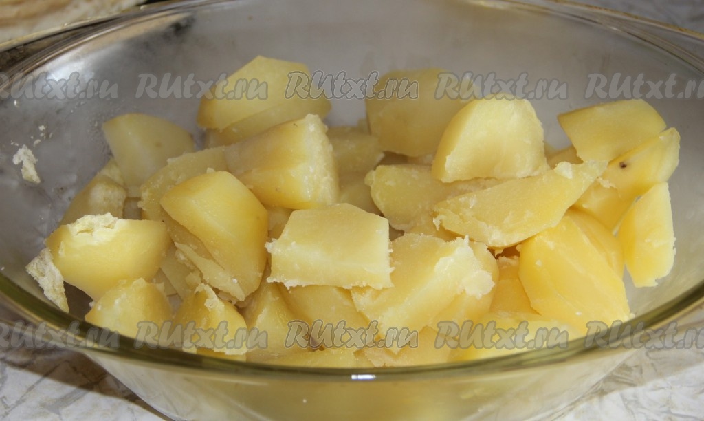 Предварительно отвариваем картофель в кожуре в несоленой воде. Очищаем его, нарезаем брусочками и выкладываем в форму для запекания.