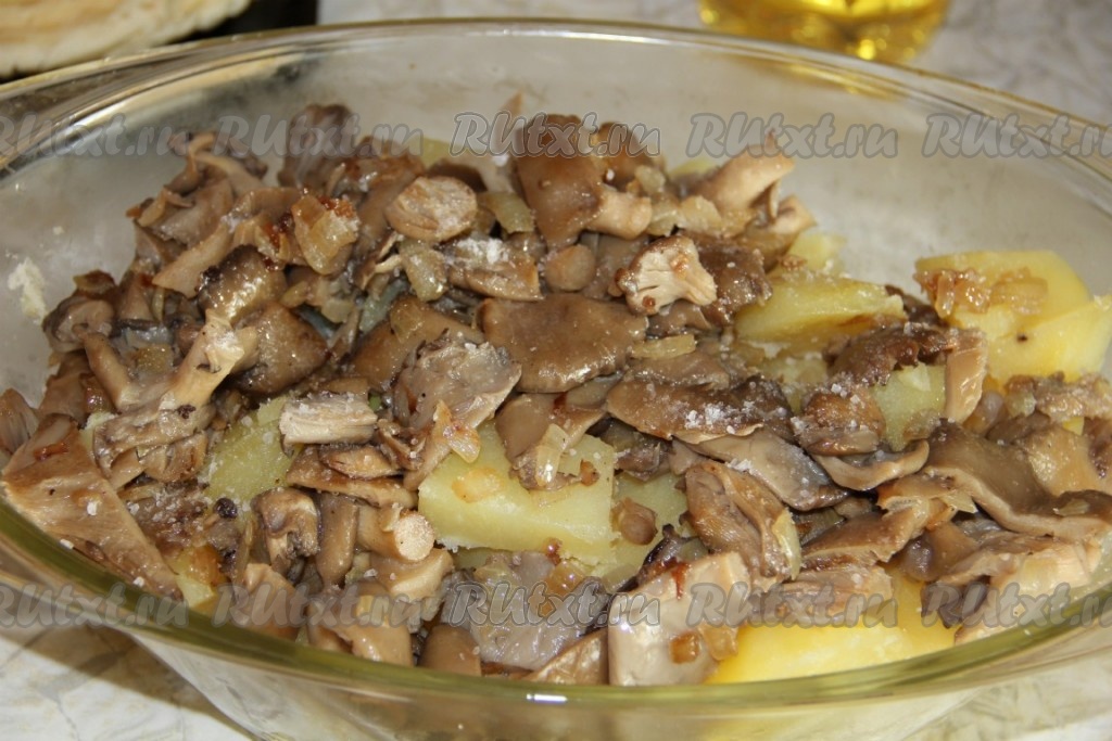 К картофелю выкладываем вешенки, обжаренные с луком, перемешиваем.