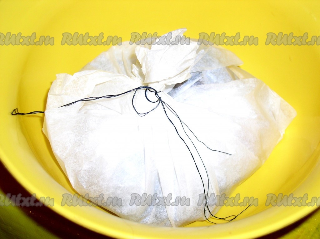 Выложить кусочки тунца и завязать бумагу для выпечки в узелок. Узелок не переворачивать.