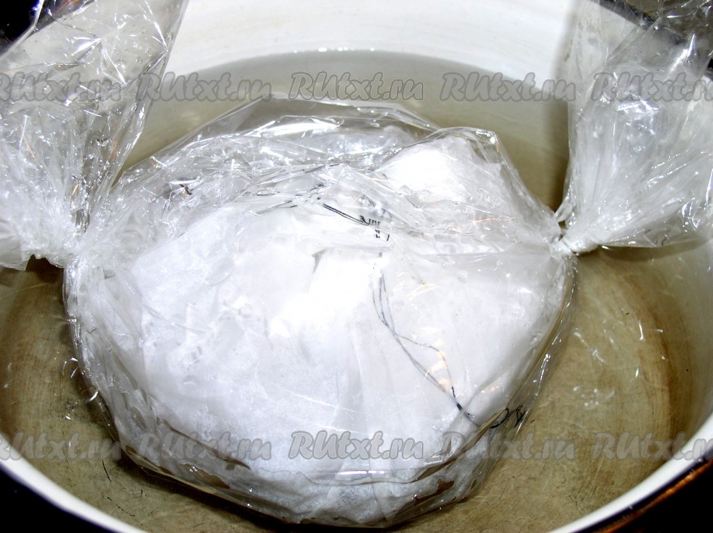Уложить узелок в рукав для запекания, зафиксировав плотно края, оставляя до 20 сантиметров свободного края с каждой стороны или собрав края сверху. Положить рукав в кипящую воду, чтобы он не касался дна. Варить тунца при среднем кипении не менее 4 часов, при необходимости подливая воду. Во время приготовления рыбка выделяет много сока и готовится фактически в собственном соку с маслом.