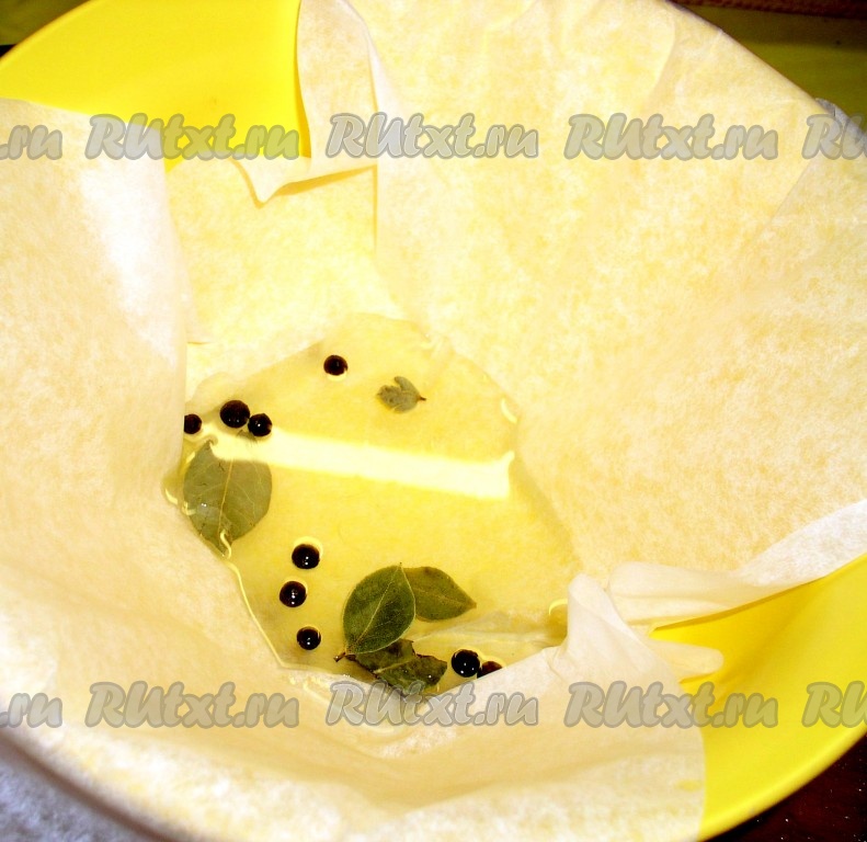 Бумагу для выпечки разместить крест-накрест в миске, влить в сделанное углубление масло и положить специи.