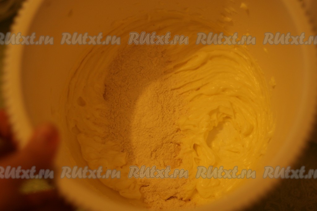 Уменьшаем скорость до минимума и добавляем ром, взбиваем в течение минуты. Постепенно вводим муку, продолжая взбивать.