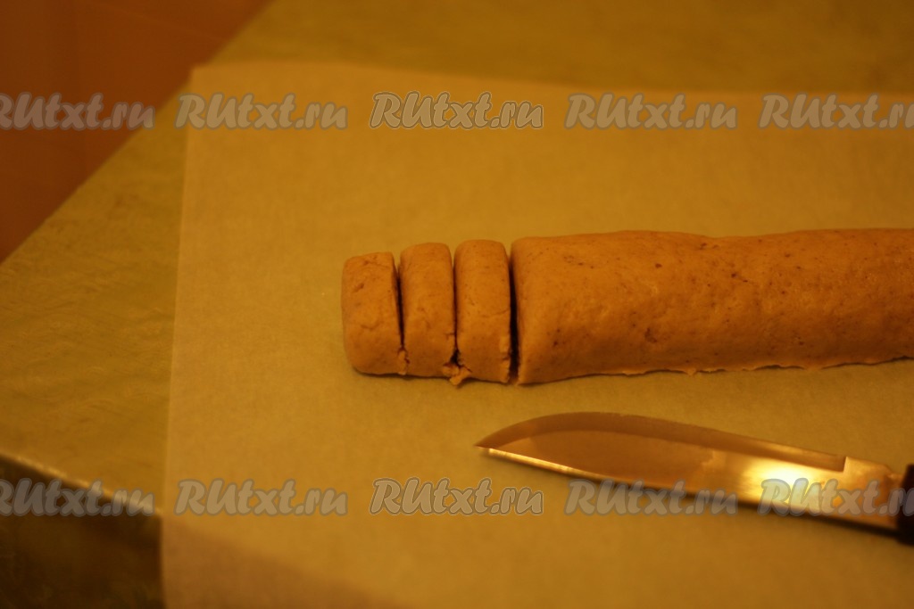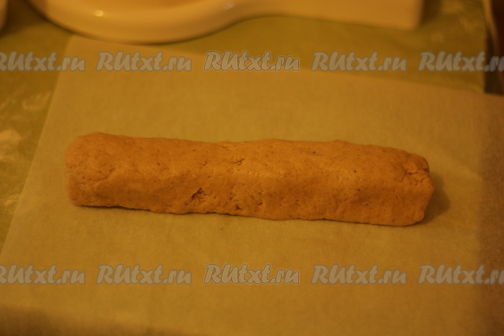 Заворачиваем в бумагу и убираем в холодильник на 1 час. Духовку разогреваем до 180 градусов. Нарезаем тесто кусочками 1-1,5 см толщиной.