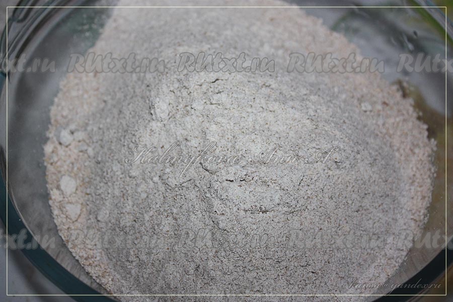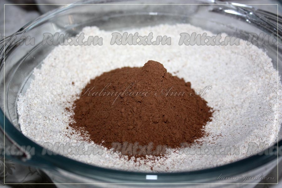 В отдельную миску отсыпать 1/3 получившейся мучной массы, оставшиеся 2/3 смешать с какао.