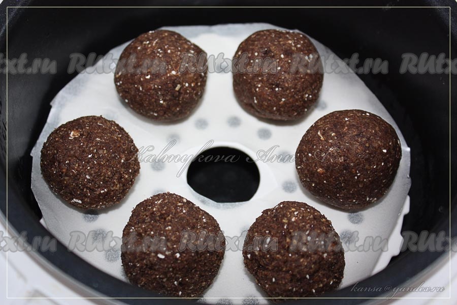 Скатанные шарики выложить на бумагу для выпечки и готовить на пару 30 минут.