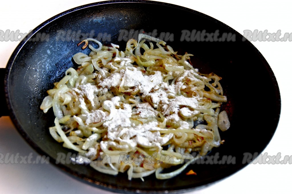 Как только лук приобретет румяный цвет, добавить муку, перемешать и прогреть 1 минуту.