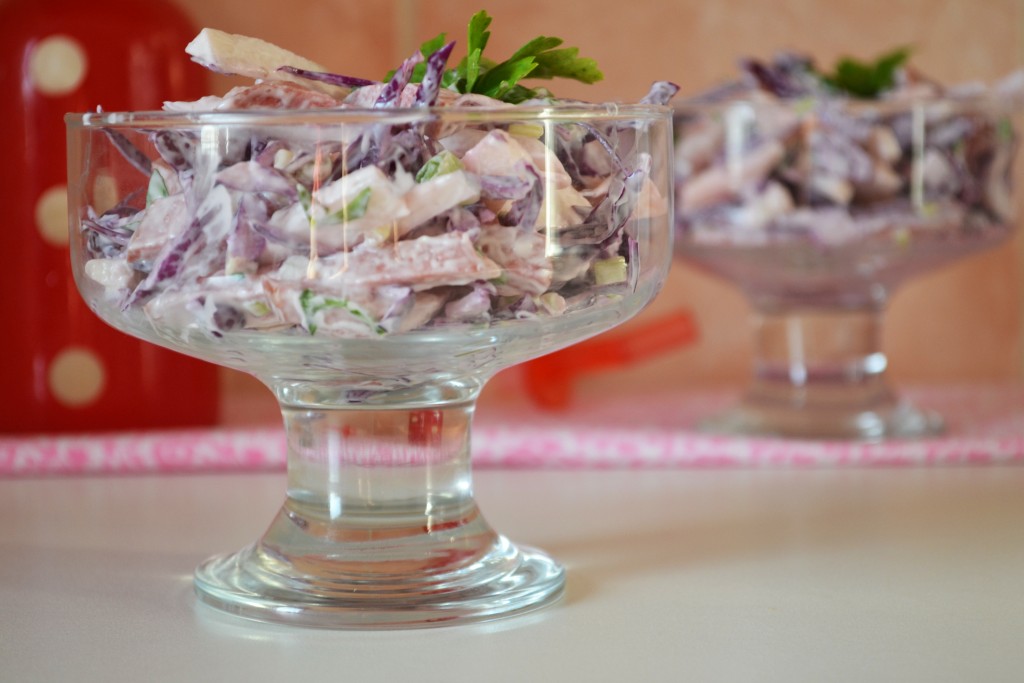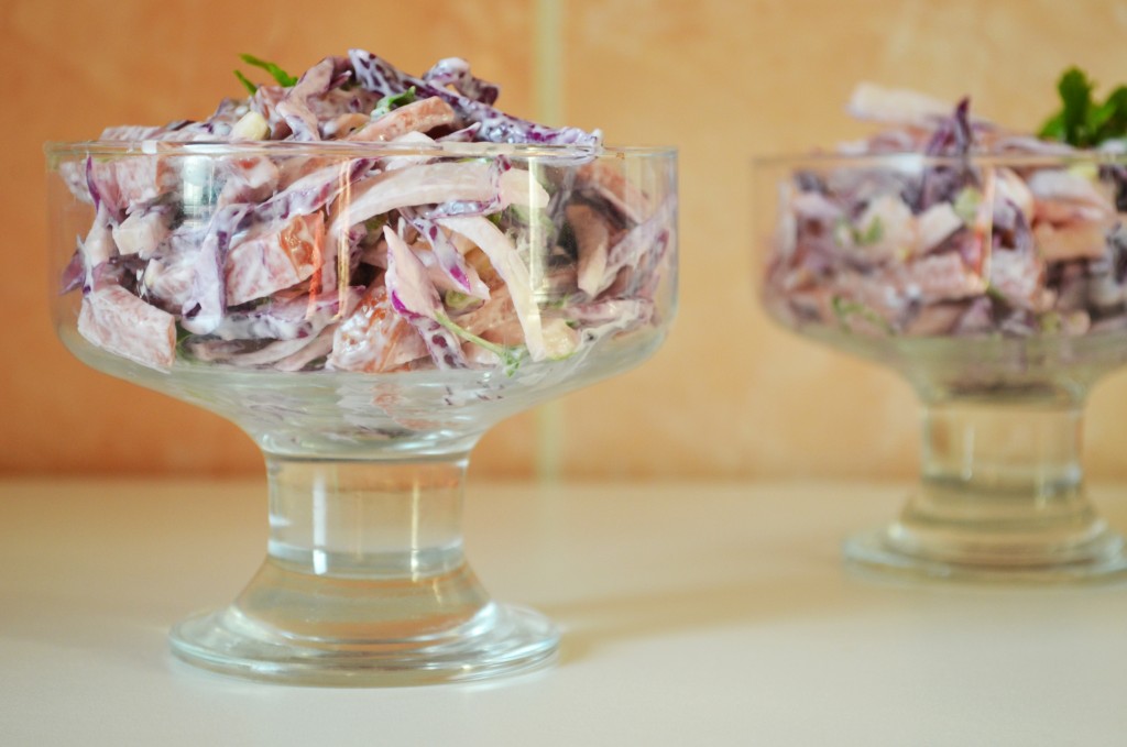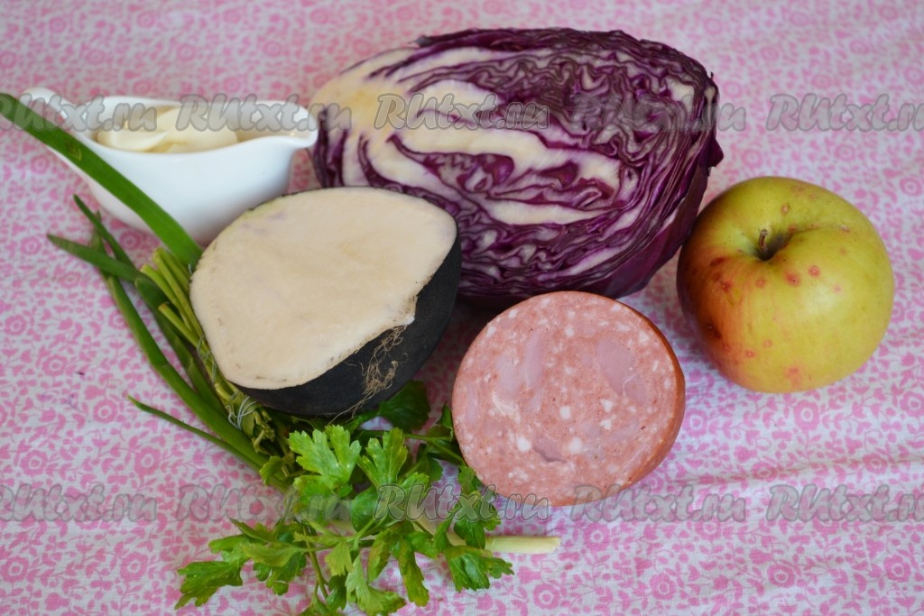 Зима только наступила, а организм уже начинает требовать витамины. Перепробовав множество различных рецептов, все равно возвращаюсь к проверенным годами, а главное - к "быстроприготовляемым" блюдам. Этот салат из краснокочанной капусты, колбасы, редьки и яблока - находка для людей не обладающих большим количеством свободного времени. Здесь главное иметь навыки быстрой шинковки и готовый, вкусный, витаминизированный, а благодаря колбасе еще и сытный салат будет у вас уже через 10 минут.