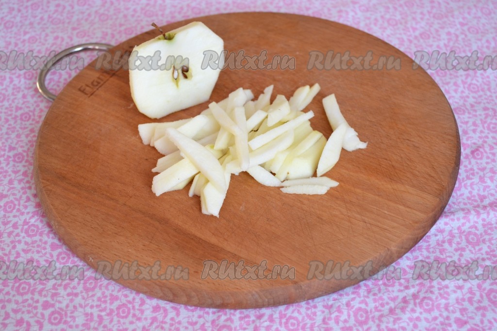 Очищаем яблоко от кожуры, сердцевины и нарезаем соломкой.