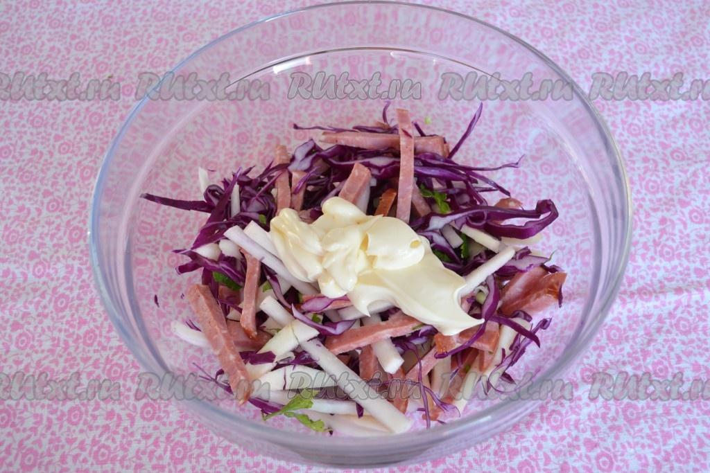Выкладываем полезный, сытный салат из краснокочанной капусты, яблока, колбасы и редьки в салатник, подаем на стол. Наслаждаемся вкусом.