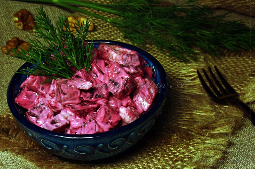 Грецкие орехи и зелень порубить мелко. Остывшие свеклу и куриную грудку соединить, добавить орехи, зелень, йогурт, специи, перемешать!
