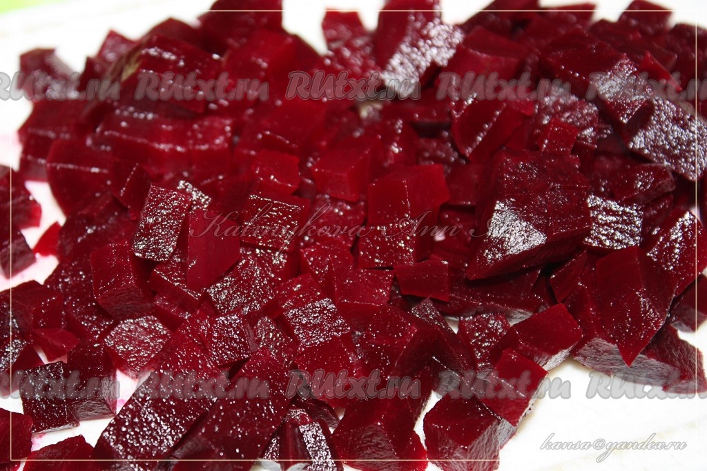 Свеклу отварить до готовности, почистить и нарезать кубиками.