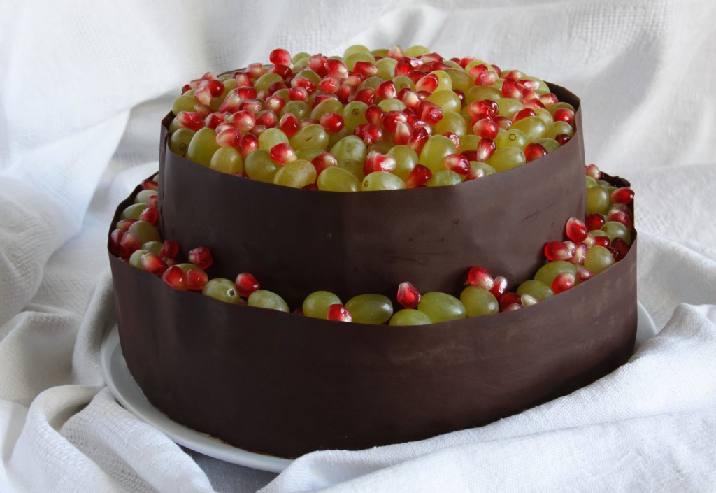 Готовый двухъярусный торт, приготовленный в домашних условиях, украсить по желанию. Я обнесла бока торта шоколадным бортиком. Для этого шоколад растопить на водяной бане. Из пергаментной бумаги вырезать полоски, ширину и высоту бортика определяйте по своему торту. Нанести шоколад на пергамент и приложить к бокам торта. Поставить торт в холодильник на 10-15 минут, для того чтобы шоколад застыл. А затем аккуратно снять пергамент. Я сделала бортики из шоколада чуть выше коржей, а в получившиеся ниши выложила свежие ягоды. Вот такой торт получился. К сожалению, нет кусочка в разрезе, так как на праздничном столе сразу съели весь торт, не оставив на утро ни кусочка.