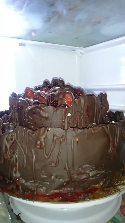 Выложить второй шоколадный корж и слегка прижать. Обмазать верх и бока торта кремом. В таком виде убрать торт в холодильник на ночь.