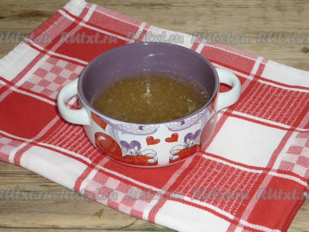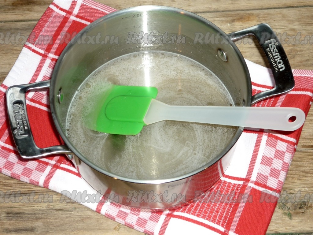 Снять сироп с огня, дать ему немного остыть. К этому времени желатин уже должен набухнуть. Добавить набухший желатин в горячий сироп, тщательно перемешать, поставить на средний огонь и, перемешивая, прогреть до растворения кристалликов желатина. Очень важно, чтобы желатин растворился, но смесь сиропа и желатина не должна закипеть.