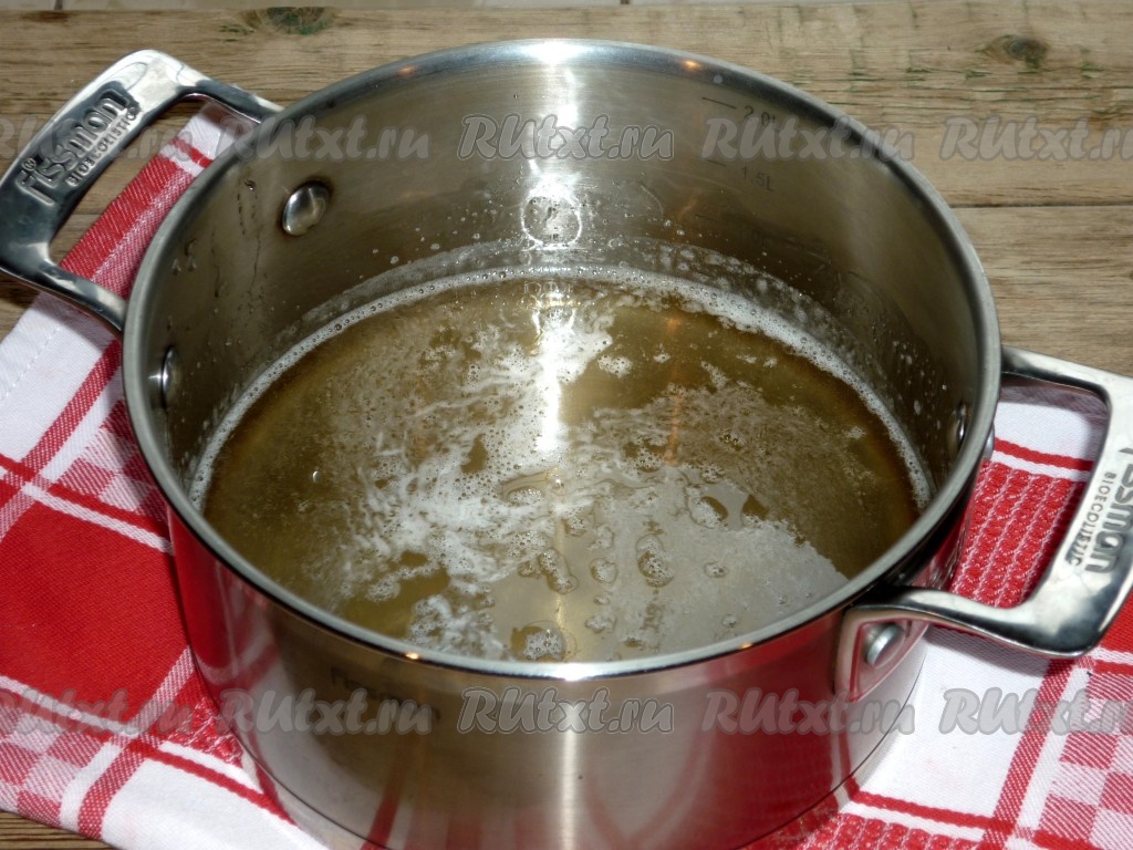 В кастрюлю насыпать сахар, влить 140 миллилитров воды, поставить на средний огонь.