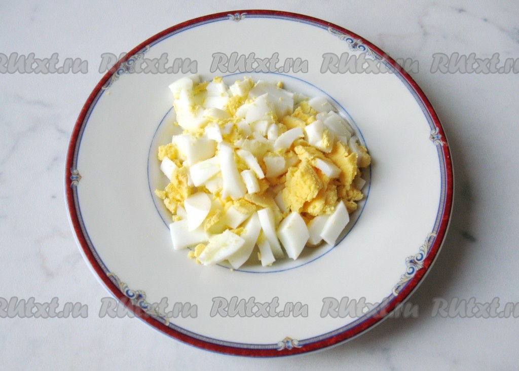 Яйца сварить вкрутую. Для этого выложить их в кастрюлю и залить холодной водой. Довести до кипения и варить с момента закипания 10 минут. Затем яйца достать, охладить и почистить. Одно яйцо мелко нарезать.