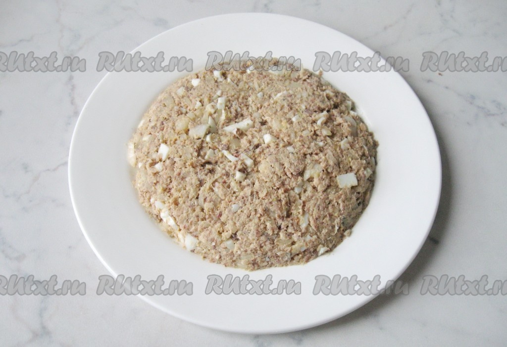 Выложить смесь сардин, отварного яйца и нарезанного лука на большую тарелку.