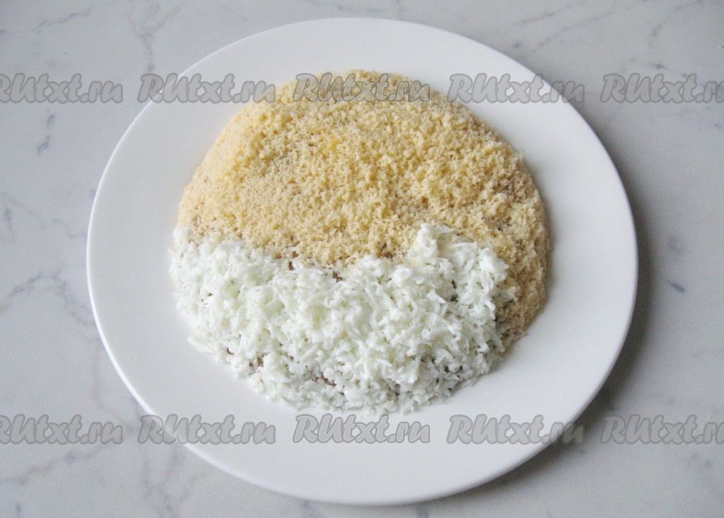 Яичный белок натереть на мелкой терке. Выложить им половину салата.