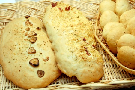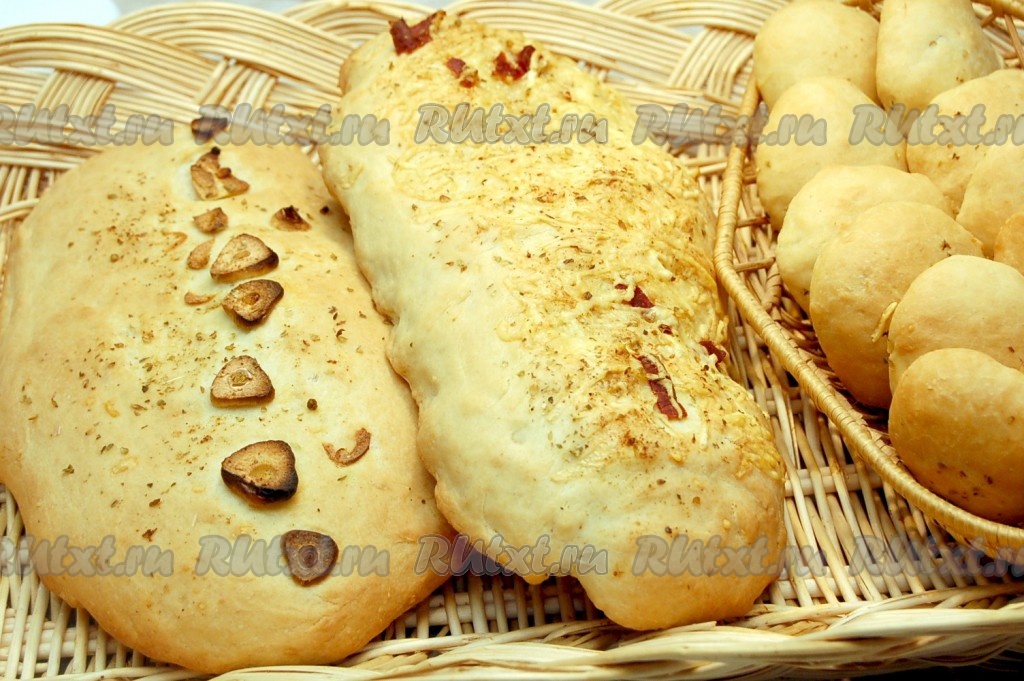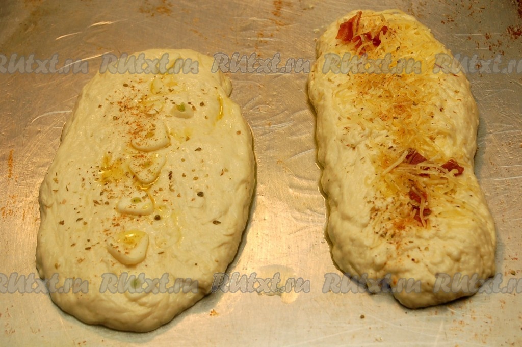 Из оставшегося теста формируем две продолговатые лепёшки, одну посыпаем нарезанными дольками свежего чеснока, а другую - оставшимся сыром. Сверху лепёшки, по желанию, посыпаем орегано (можно добавить и другие специи по вкусу), сбрызгиваем оливковым маслом.
