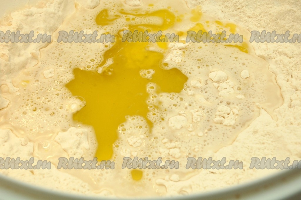 Соединим муку с дрожжами и пальцами перетрём их, а уже затем добавим тёплую воду (температура воды должна быть не выше 40 градусов), оливковое (или растительное) масло и соль.