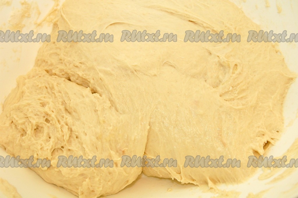 Тщательно перемешиваем и получаем достаточно липкое тесто, но муки не надо больше добавлять. Тесто убираем на 1,5 часа в тёплое место (или на ночь в холодное место).