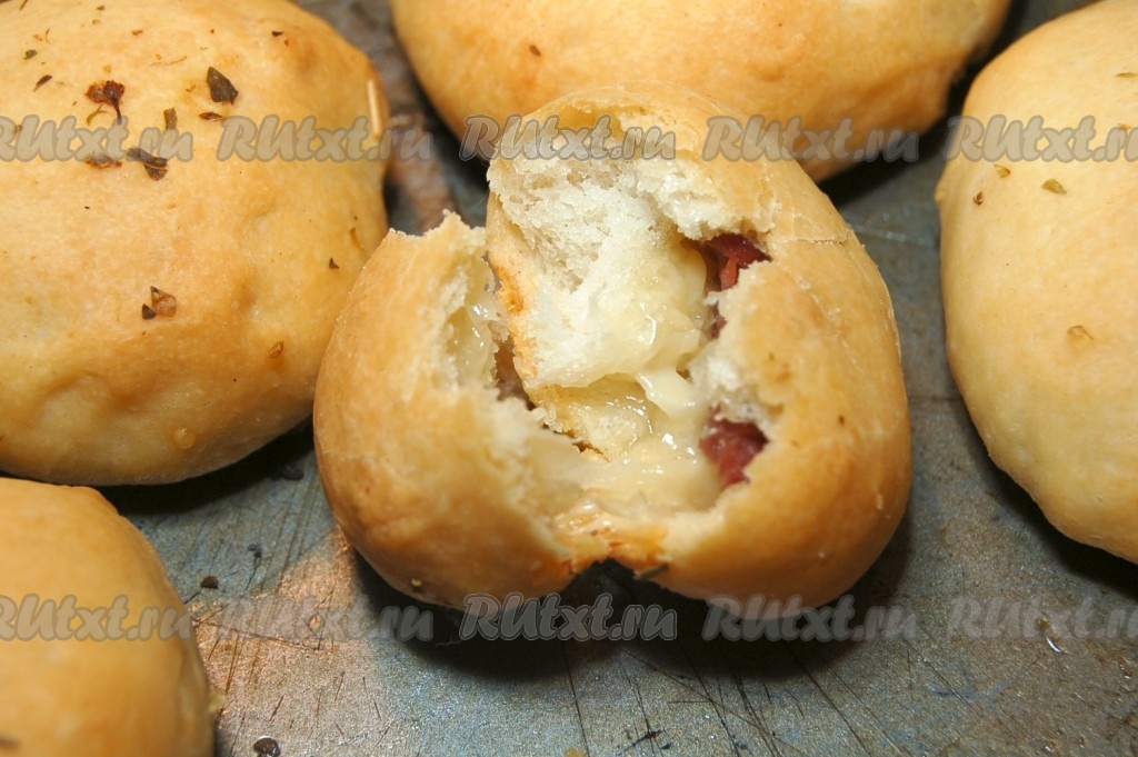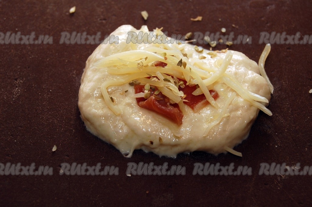 Для приготовления булочек с начинкой отщипываем небольшой кусочек теста, расплющиваем его, в центр выкладываем немного нарезанных колбасных изделий, присыпаем натёртым сыром, по желанию, посыпаем орегано.