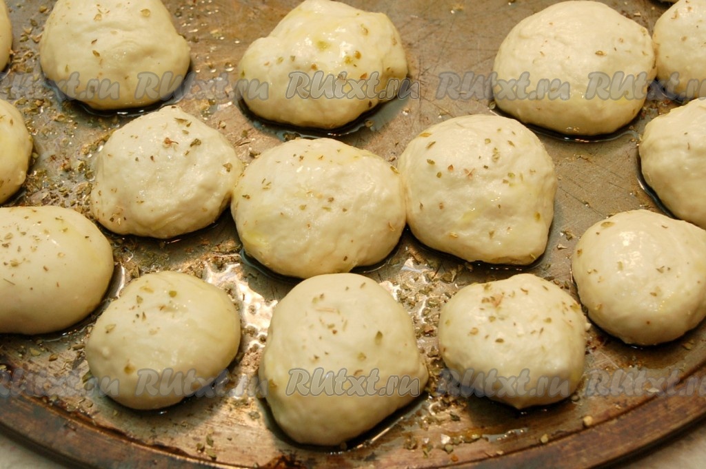Защипываем края теста, формируя булочку. Аналогично формируем все булочки с начинкой и выкладываем их на противень, смазанный оливковым маслом.