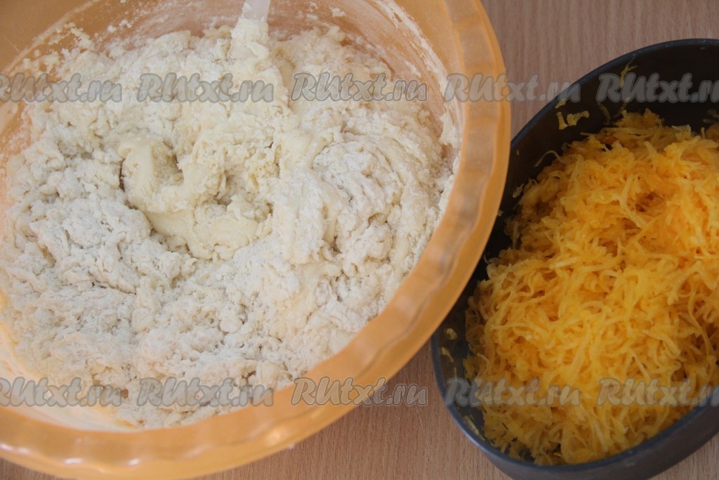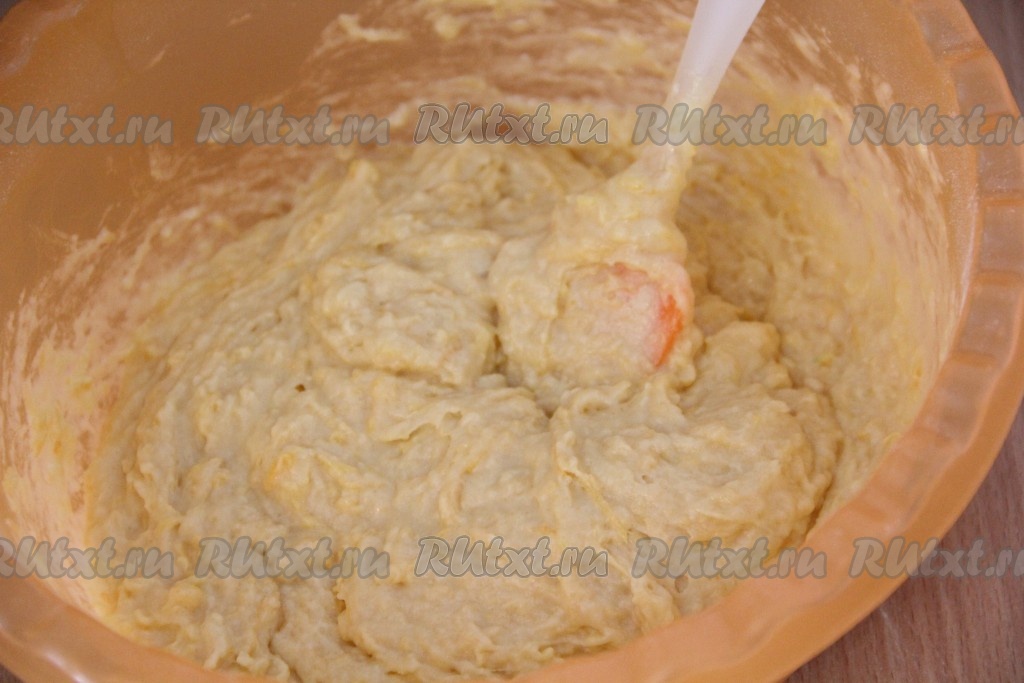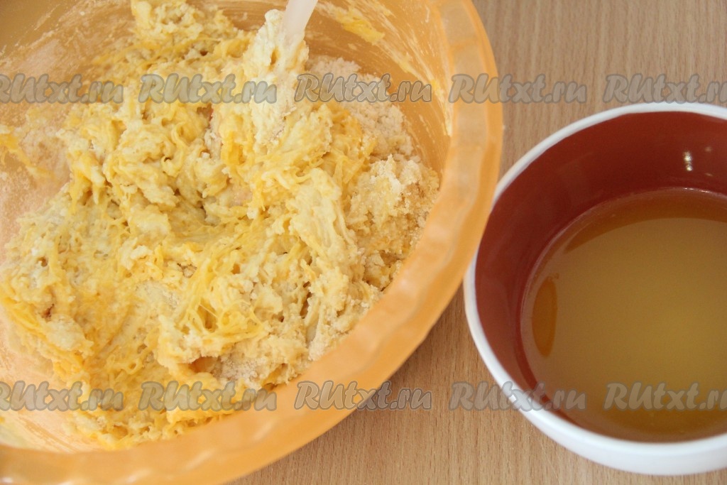 Влить растопленное масло в тесто и всё тщательно перемешать. Тесто получится достаточно густым, гладким, с прожилками тыквы.