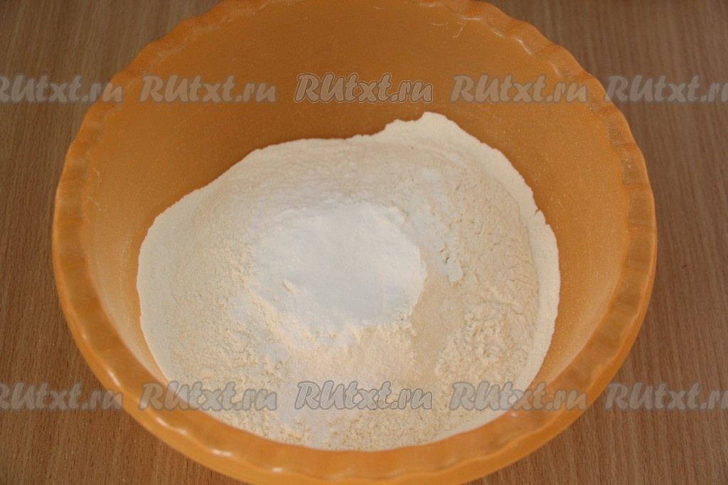 В глубокую миску просеять муку, добавить разрыхлитель и соль, перемешать.