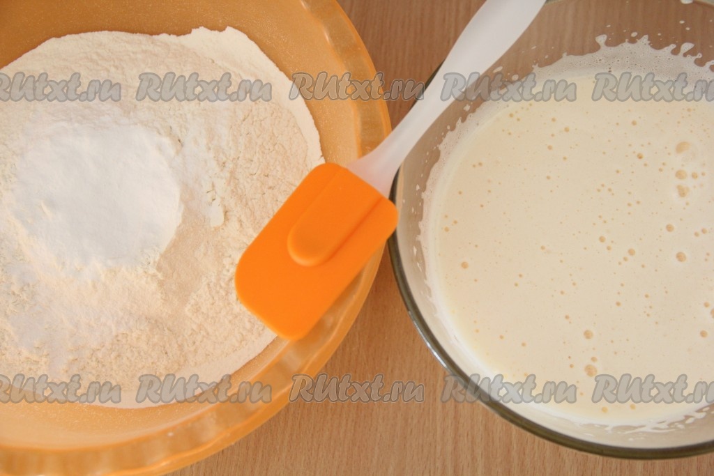 Влить получившуюся яичную массу в миску со смесью муки, разрыхлителя и соли.