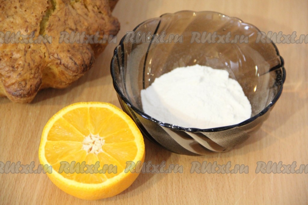Перед подачей можно посыпать кекс сахарной пудрой, а я решила приготовить сахарную глазурь и покрыть ею тыквенный кекс. Для приготовления глазури я взяла 4 столовых ложки сахарной пудры и немного апельсинового сока. В сахарную пудру добавлять "каплями" апельсиновый сок и тщательно перемешивать. Как только консистенция глазури будет гладкой, однородной и слегка льющейся, нужно покрыть глазурью кекс.