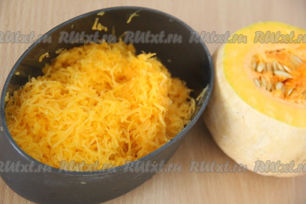 Добавить в тесто натёртую сырую тыкву. Не нужно отжимать сок от тыквы, нам потребуется эта влага. Хорошо перемешать. Тесто для тыквенного кекса получится вязким и липким. Масло растопить и слегка остудить.