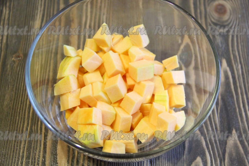 Мякоть тыквы нарезать на небольшие кубики. И поставить в микроволновую печь на 5-7 минут при высокой мощности. Можно запечь тыкву в духовке, но на это нужно больше времени.