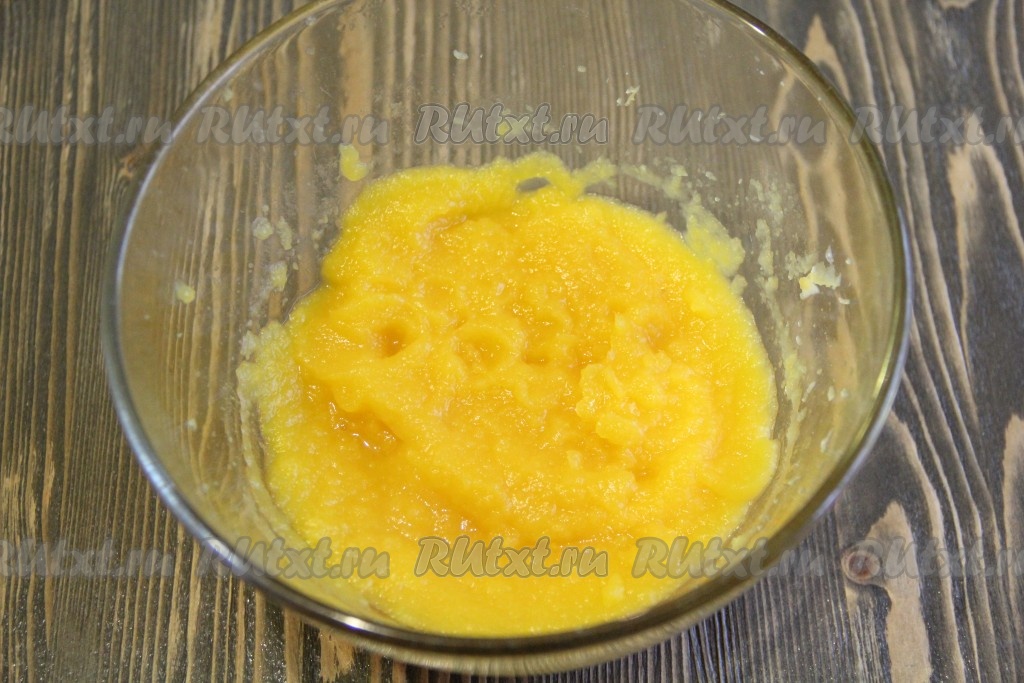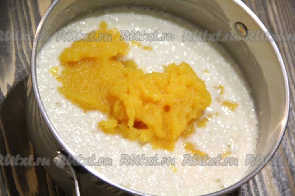 Всё хорошо перемешать с помощью венчика. Затем добавить тыквенное пюре.