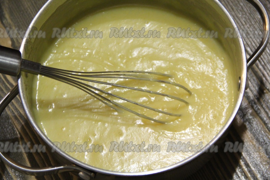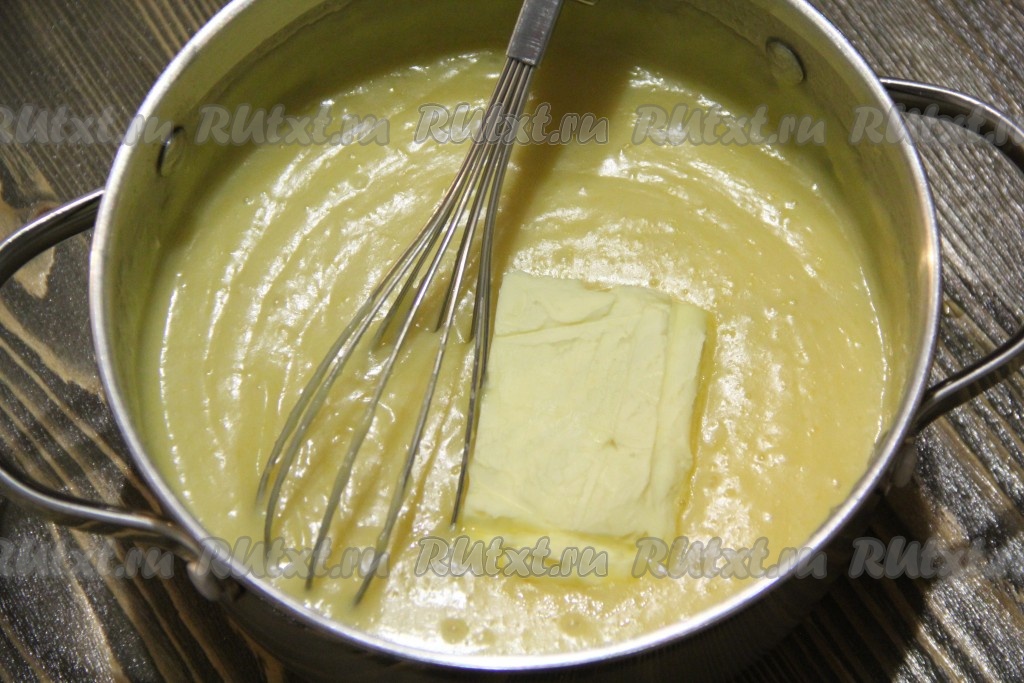 Снять крем с огня, добавить размягченное масло и тщательно перемешать крем венчиком. Масло должно полностью раствориться и тыквенный крем должен стать однородным, гладким и блестящим. Накрыть кастрюльку крышкой и полностью остудить крем.