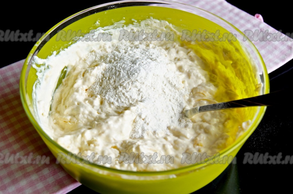 В эту смесь всыпать половину муки, разрыхлитель, 2 щепотки соли, перемешать до однородности. Начать добавлять оставшуюся муку по столовой ложке, каждый раз вмешивая её в тесто. Муки может понадобиться чуть больше или меньше, тесто для оладий должно получиться, как густая сметана.