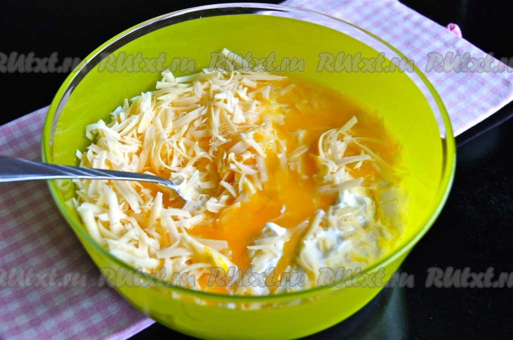 Сливочное масло растопить на плите (или в микроволновке), дать ему немного остыть. Для замешивания теста для оладий нужно в объёмную миску выложить сметану, добавить натёртый на крупной тёрке сыр, сырые яйца, растопленное и чуть остывшее сливочное масло, натёртый на мелкой тёрке чеснок и хорошенько перемешать. Если не любите чеснок, то можете его не добавлять.