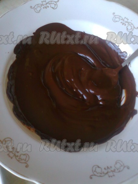Половину шоколада (50 грамм) растапливаем на водяной бане, добавляем оставшуюся половину (50 грамм) и 1 чайную ложку подсолнечного масла. При необходимости подогреваем на водяной бане.