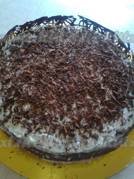 Вынимаем наш тортик "Черный лес" из холодильника, даем нагреться шоколадной ленте 5 минут (чтобы лента не треснула), прикладываем к торту, снимаем пергаментную бумагу.