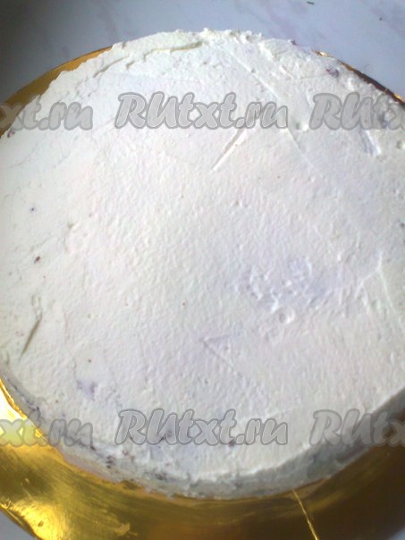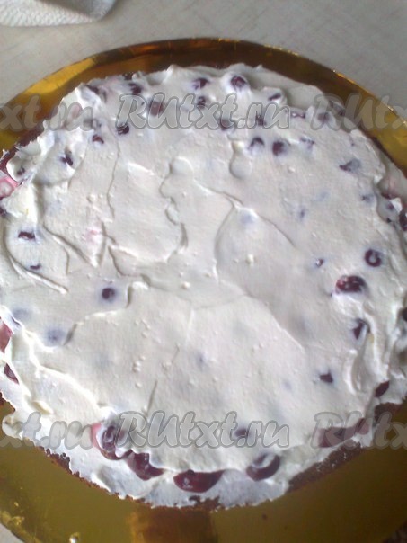 Взбить сливки. Перед взбиванием сливки нужно хорошо охладить. 100 мл сливок отложить для украшения. Остальные сливки (400 мл) взбить миксером на средней скорости, пока они не начнут густеть. Добавить постепенно 5 столовых ложек сахара. Продолжать взбивать, пока от венчика не начнет оставаться четкий рельеф. Смазать пропитанный корж частью взбитых сливок и выложить сверху вишни из сиропа.