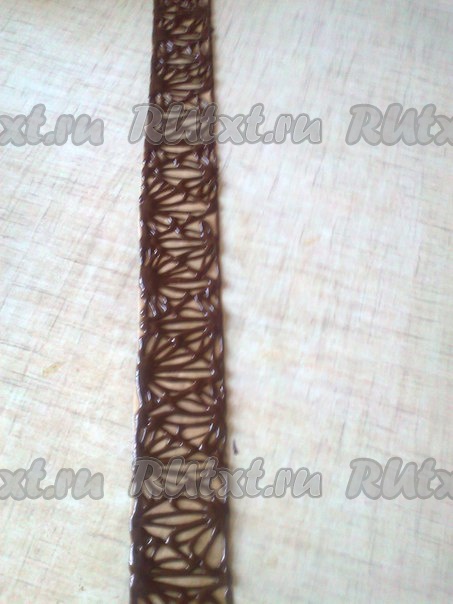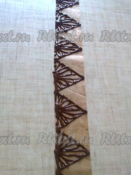 Накрыть вторым коржом и обмазать верх и бока торта оставшимися взбитыми сливками. Ставим шварцвальдский вишневый торт для остывания в холодильник. Для украшения 50 грамм шоколада крошим ножом на верх торта. Бока торта можно тоже украсить шоколадной крошкой или использовать шоколадную ленту. Приготовим шоколадную ленту. Из пергаментной бумаги вырезаем полоску соответствующую длине и высоте торта. Рисуем на ней карандашом основу для будущего узора. У меня треугольники с основанием 6 см.