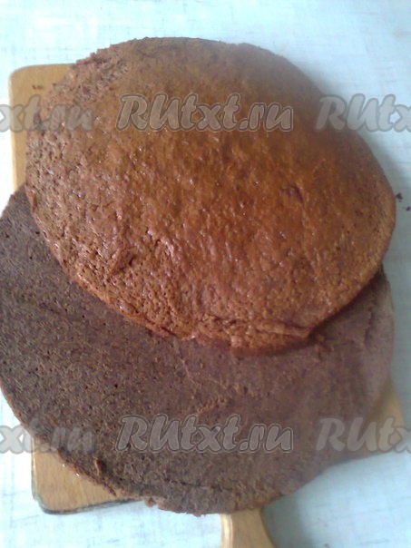 Бисквит разрезать на 2 коржа, каждый корж пропитать вишневым сиропом.
