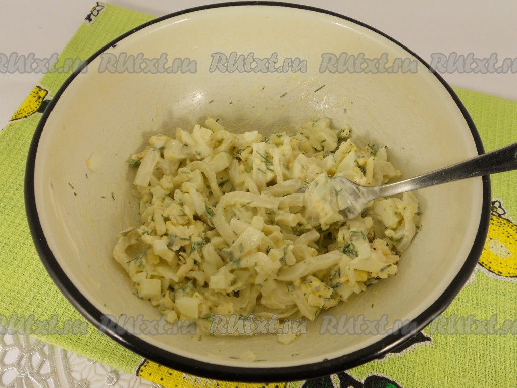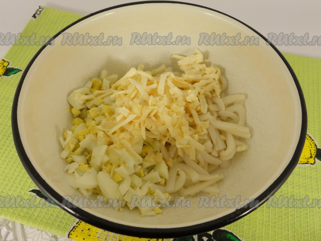 Кальмары нарезать тонкой соломкой, сложить в миску. Яйца предварительно отварить вкрутую (в течение 10 минут после начала кипения воды), остудить, очистить, нарезать на средние кусочки, переложить в миску с кальмарами.